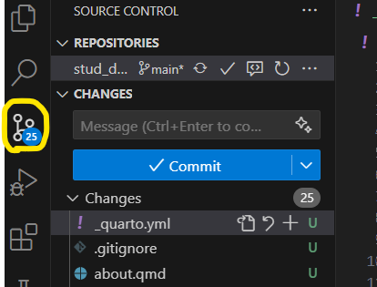 quarto renderin the terminal. This will run all your files and build the website. You’ll notice that adocsfolder has been created. That is where all the html files are stored, and it serves as the top level folder for your website.We will now implement the “pull, add, commit, push” workflow in VSCode to sync our local files with the files on GitHub.