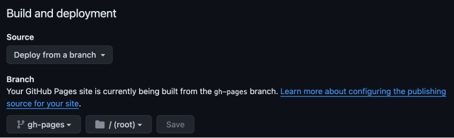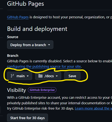 c. Change the branch option from “none” to “main”, and change the folder next to it from “/(root)” to “/docs”. Don’t forget to click ‘Save’!
