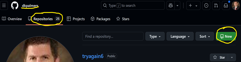 Go to your GitHub home page. Click on the “Repositories” tab, and then click the big, green “new” button.