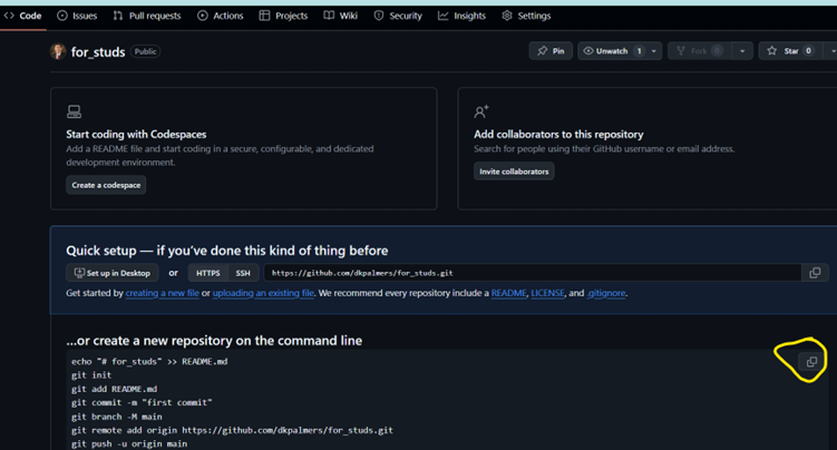On the next page, copy all the code it provides under the heading “…or create a new repository on the command line” so you can paste it into your terminal