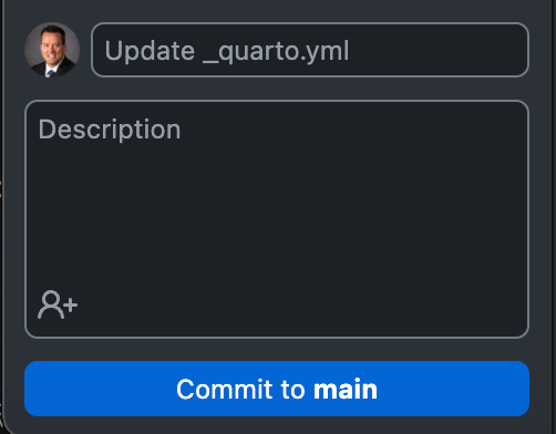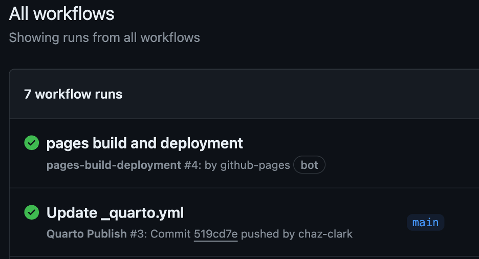 Update _quarto.ymlis working by the yellow circle turning to a green check circle (Note: this can take 3-5min)